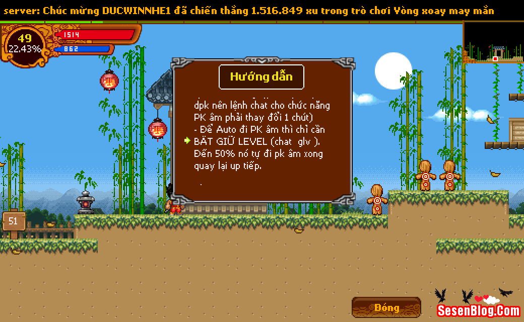 – Để Auto đi PK âm thì chỉ cần BẬT GIỮ LEVEL (chat “glv”). Đến 50% nó tự đi pk âm xong quay lại up tiếp.