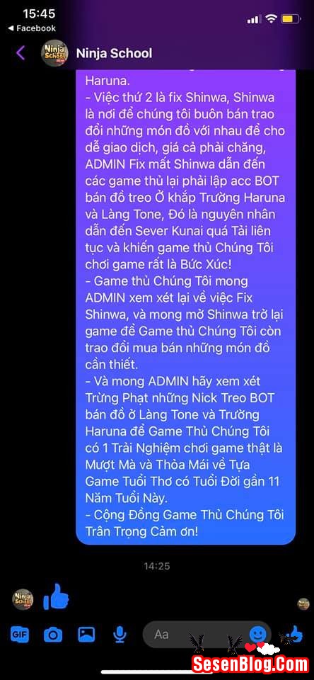 – Việc thứ 2 là fix Shinwa, Shinwa là nơi để chúng tôi buôn bán trao đổi những món đồ với nhau để cho dễ giao dịch, giá cả phải chăng, ADMIN Fix mất Shinwa dẫn đến các game thủ lại phải lập acc BOT bán đồ treo Ở khắp Trường Haruna và Làng Tone, Đó là nguyên nhân dẫn đến Sever Kunai quá Tải liên tục và khiến game thủ Chúng Tôi chơi game rất là Bức Xúc!
