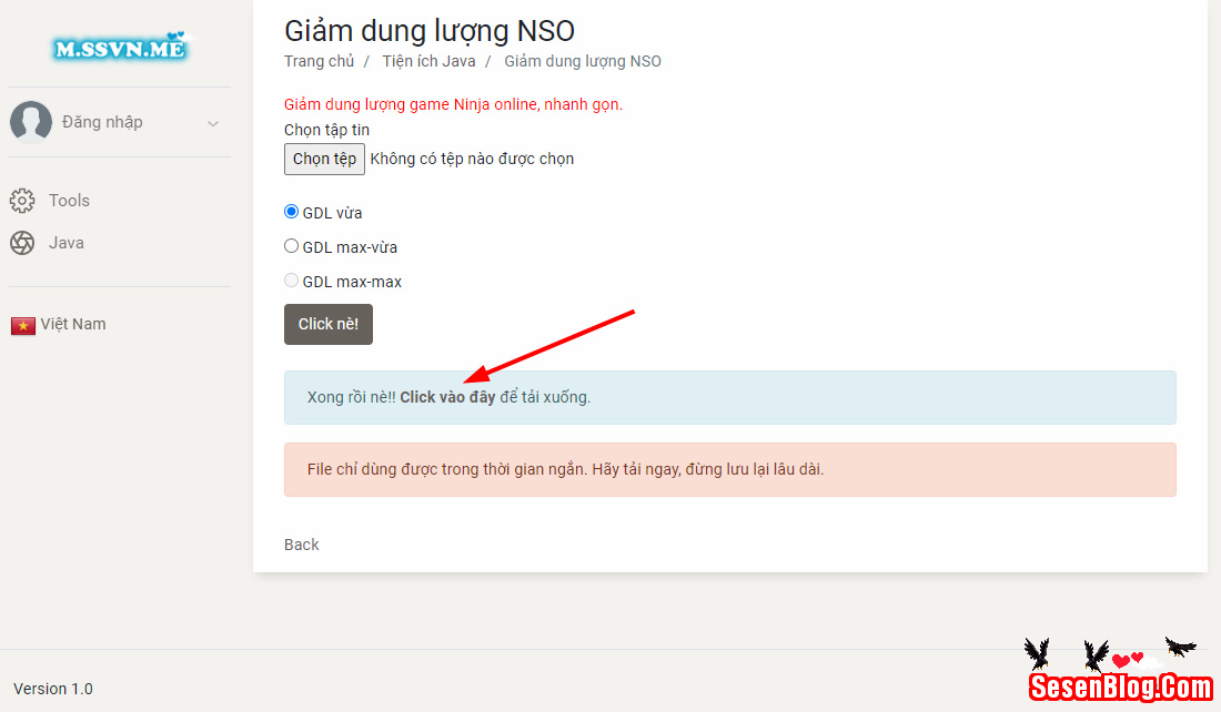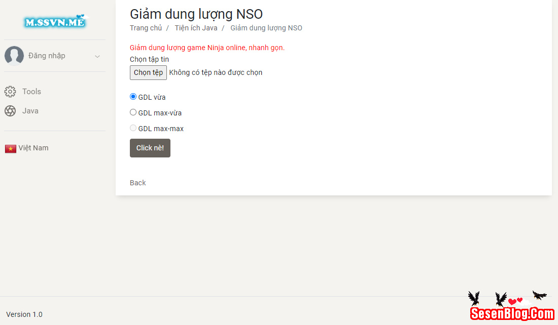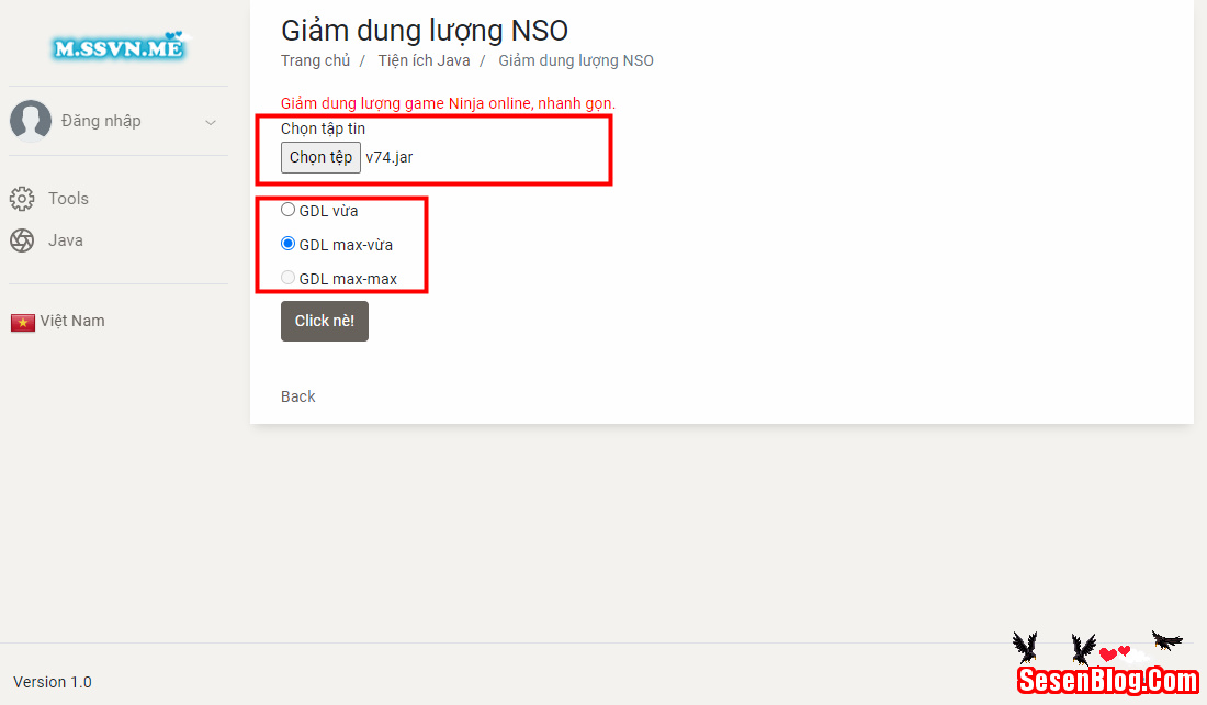 Bước 2: Chọn file game ninja, sau đó chọn 1 trong các tùy chọn giảm dung lượng bên dưới, sau đó ấn Click.