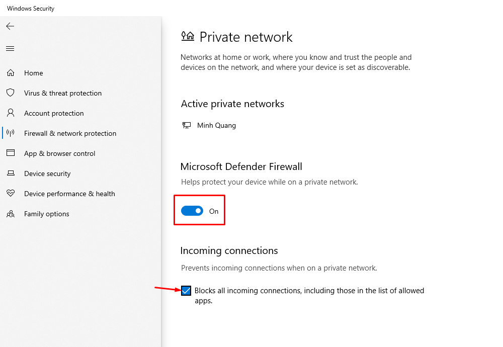 Bước 2: Với Private network, mục Microsoft Defender Firewall > On. Tick vào Block all incoming connections, including those in the list of allowed apps trong mục Incoming connections. Nếu muốn tắt tường lửa Win 10, bạn chỉ cần gạt thanh tại mục Microsoft Defender Firewall sang trái và bỏ tick Incoming connections.