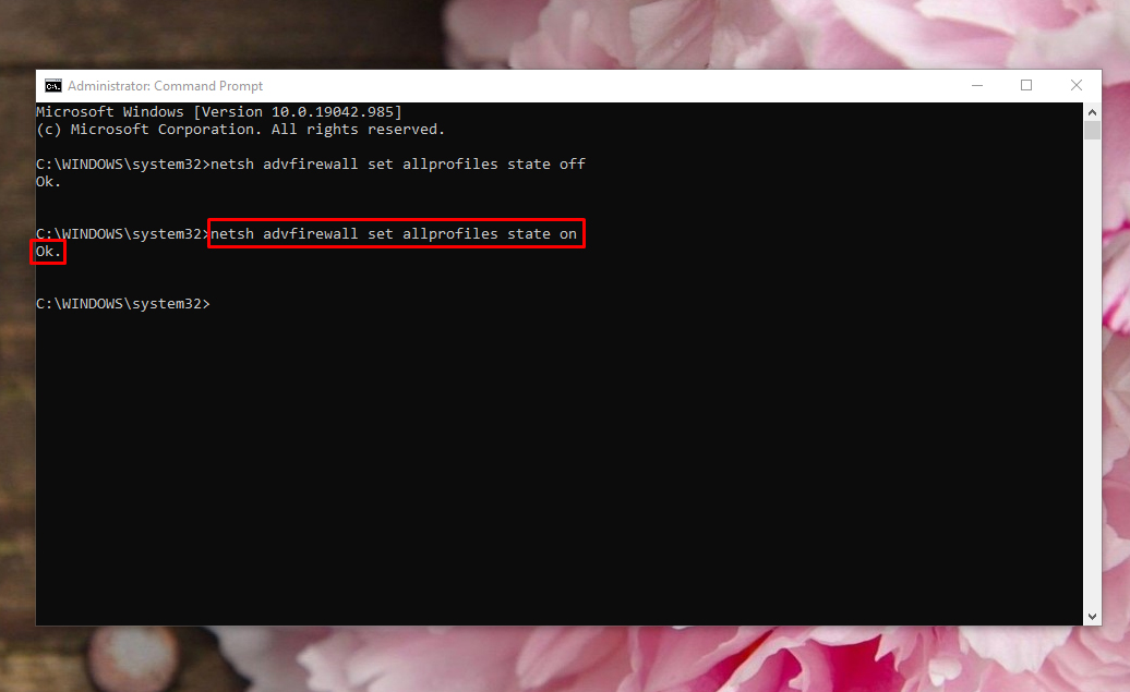 Bước 3: Để bật tường lửa, bạn nhập câu lệnh “netsh advfirewall set allprofiles state on” vào cửa sổ Command Prompt rồi nhấn Enter. Nếu thành công, màn hình sẽ hiển thị OK.