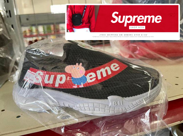 12. Chúng ta không lạ gì với các đồ thời trang Supreme fake ở Việt Nam. Nhưng đây có thể là mẫu giày mới mà Supreme sản xuất ra dành riêng cho các rich kids có hình chú heo Peppa pig khá xinh xắn và đáng yêu.