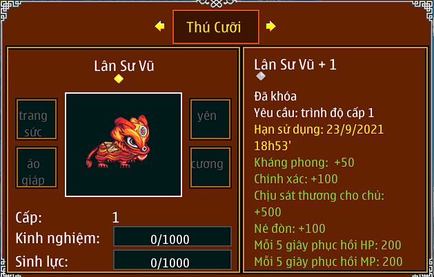 – Lưu ý lân sư vũ không thể mang trang bị thú